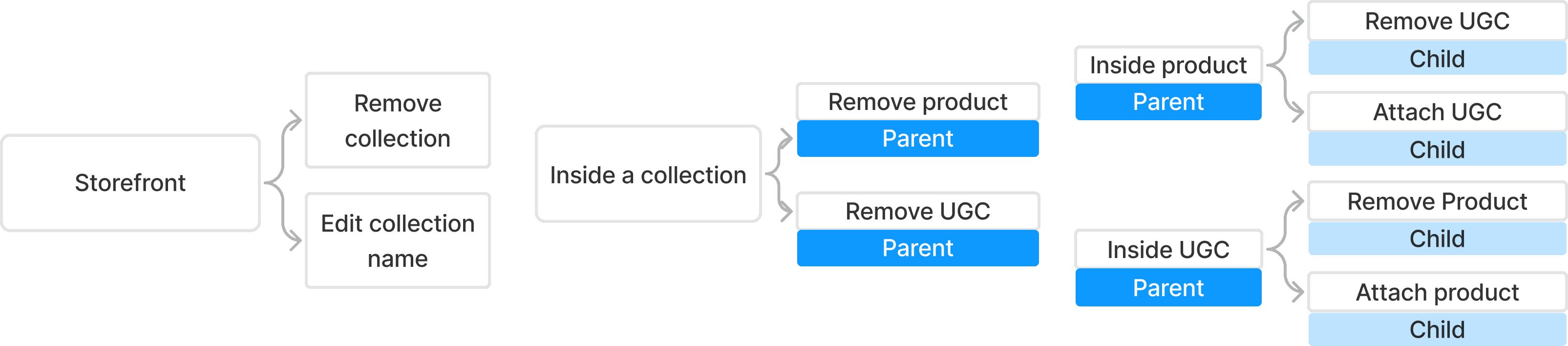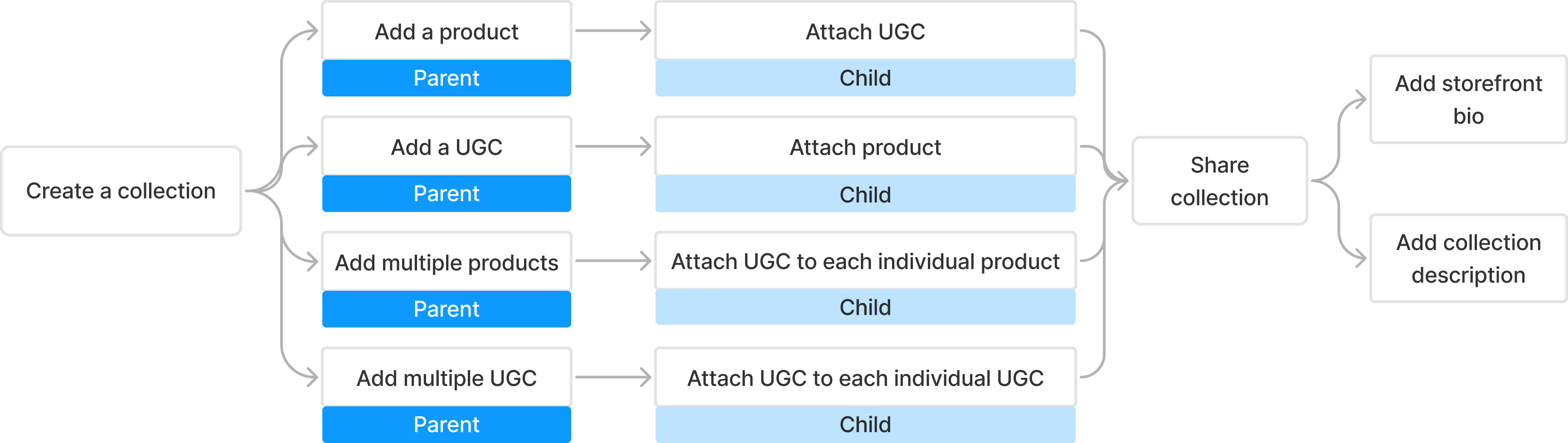 Product with 1 or more UGC attached is a parent; attached UGC becomes the child