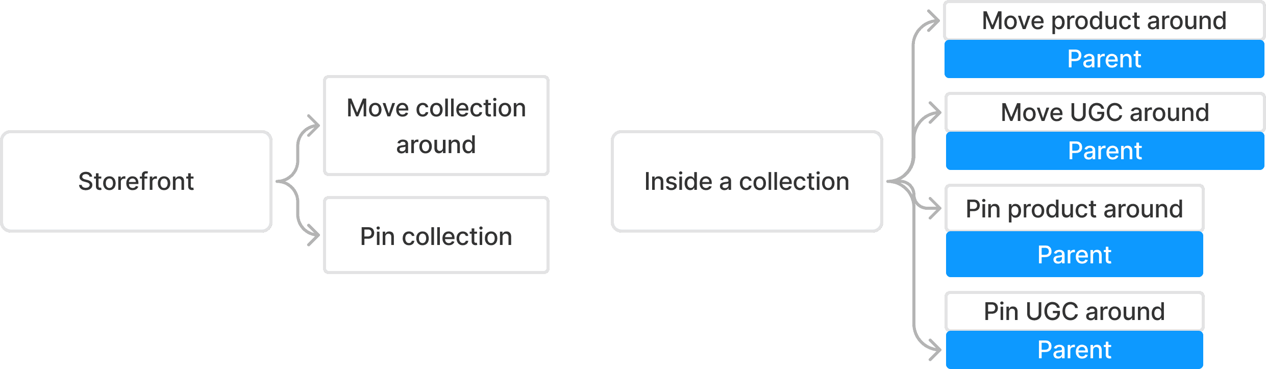 This sitemap illustrates the definitions of parent products, parent UGC, child products, and child UGC, along with their interrelationships and possible combinations within a collection. Rules designed to prevent loops and ensure system integrity in backend engineering are highlighted and explained in red.