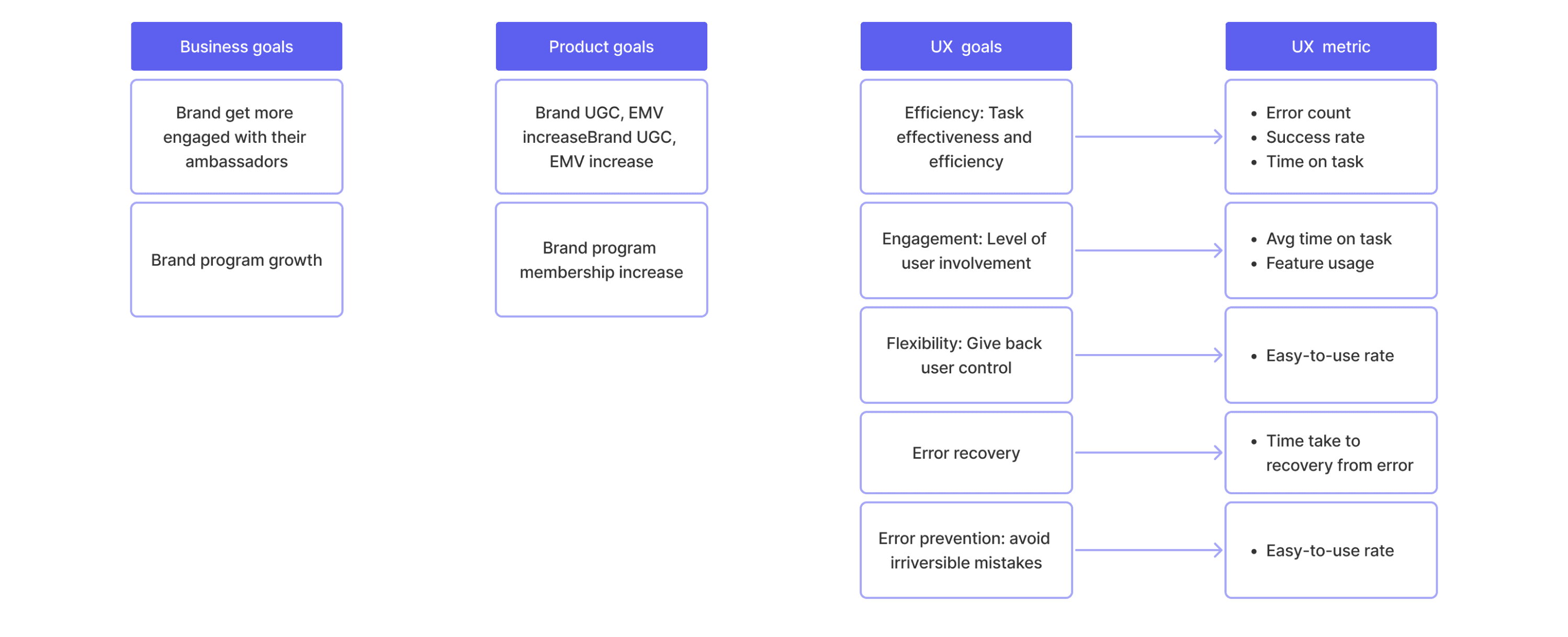 The first thing is to set up clear design goals I want to accomplish. To understand what success looks like, I used guiding questions to define the UX design goals and UX metrics.