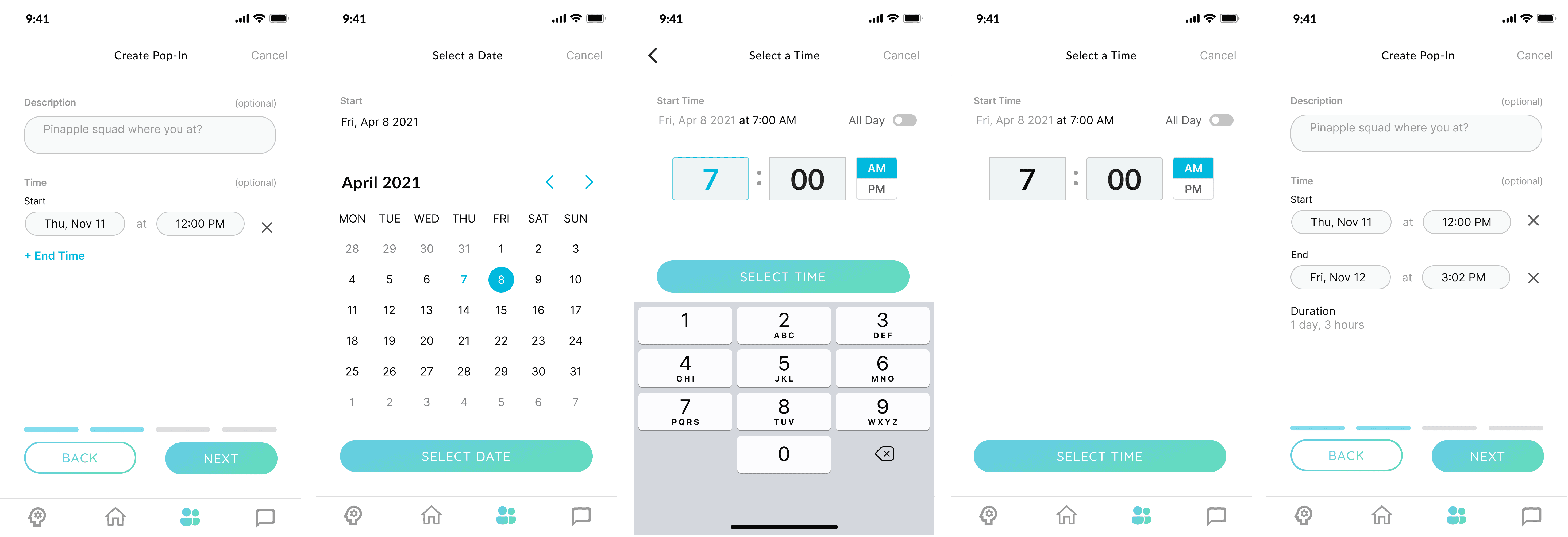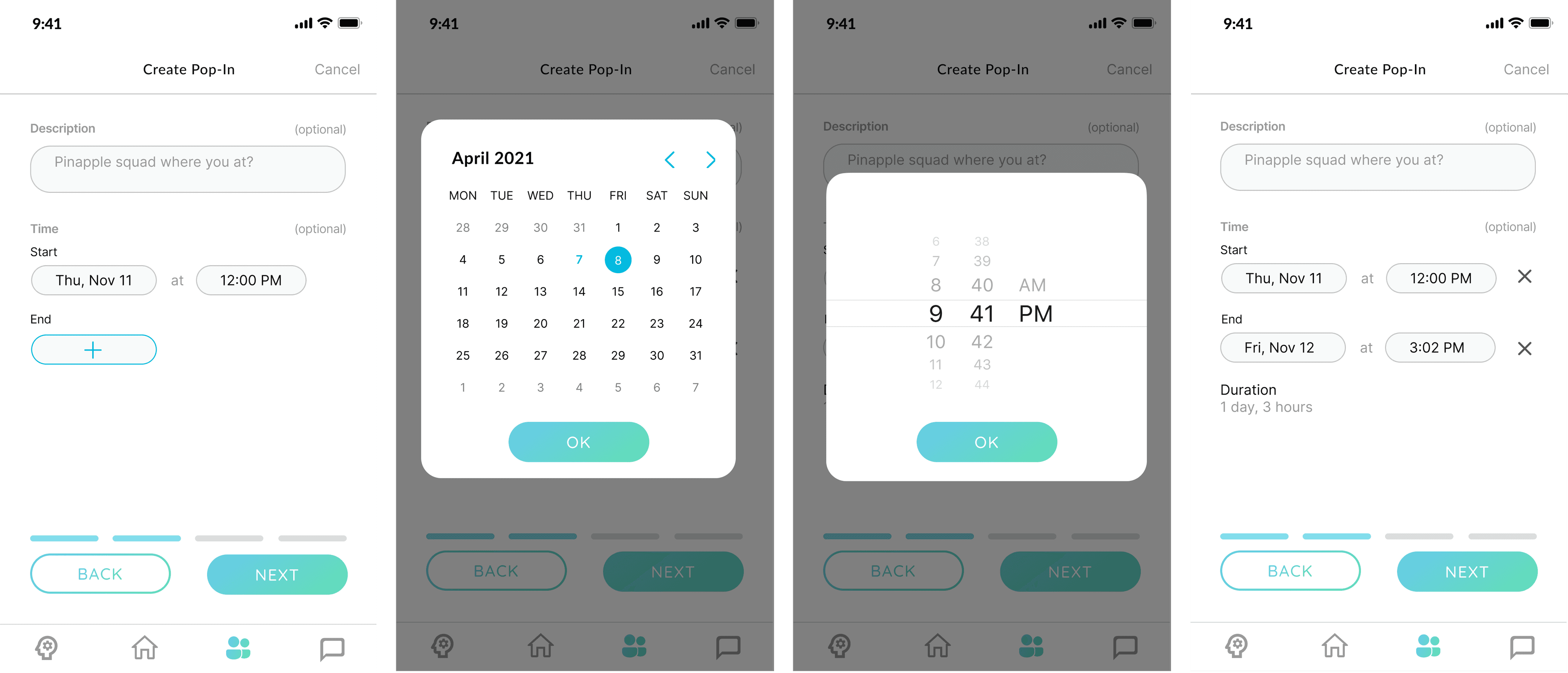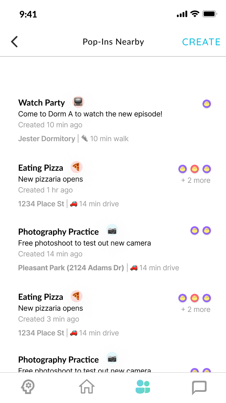 Pop in is a unique feature which none of the competitors in the relationship building problem space is doing, however, the most valuable feature of the app is not very usable for the users based on previous user interviews. The average time spend on the app is 7 min per user, but to create a pop in takes about 1 min which is not a good metric as ideally user would spend more time in browsing Pop Ins to join and swapping through the carousal to find friend to match. Task completion rate is low and the error rate for creating the Pop In is also high for what we imagined ideally.