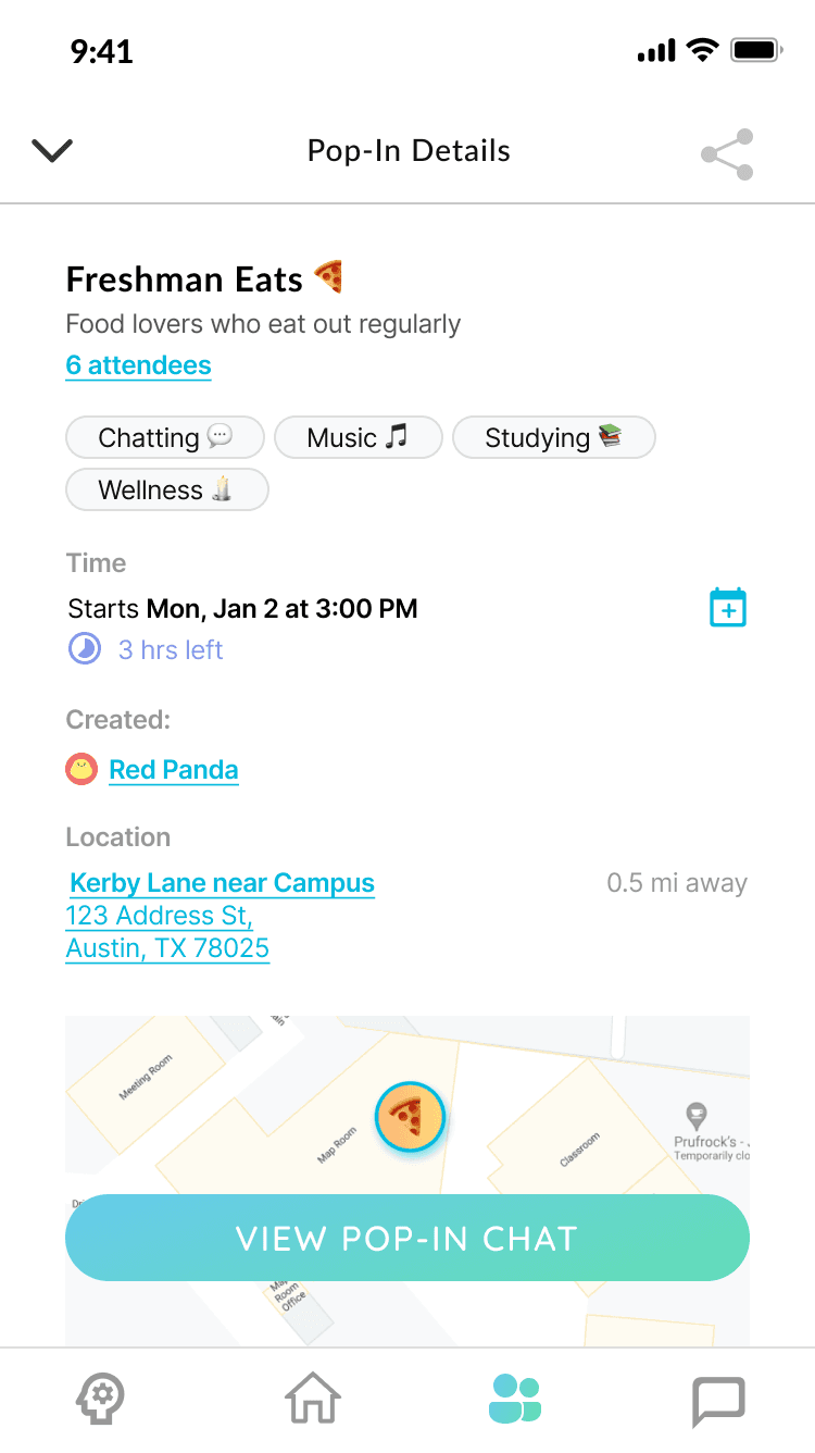 In February 2022, I join POP’s design team as a UX design intern. POP is an app focused on providing a safe space for college students to meet new friends in a convenient, stress-free and personalized way.