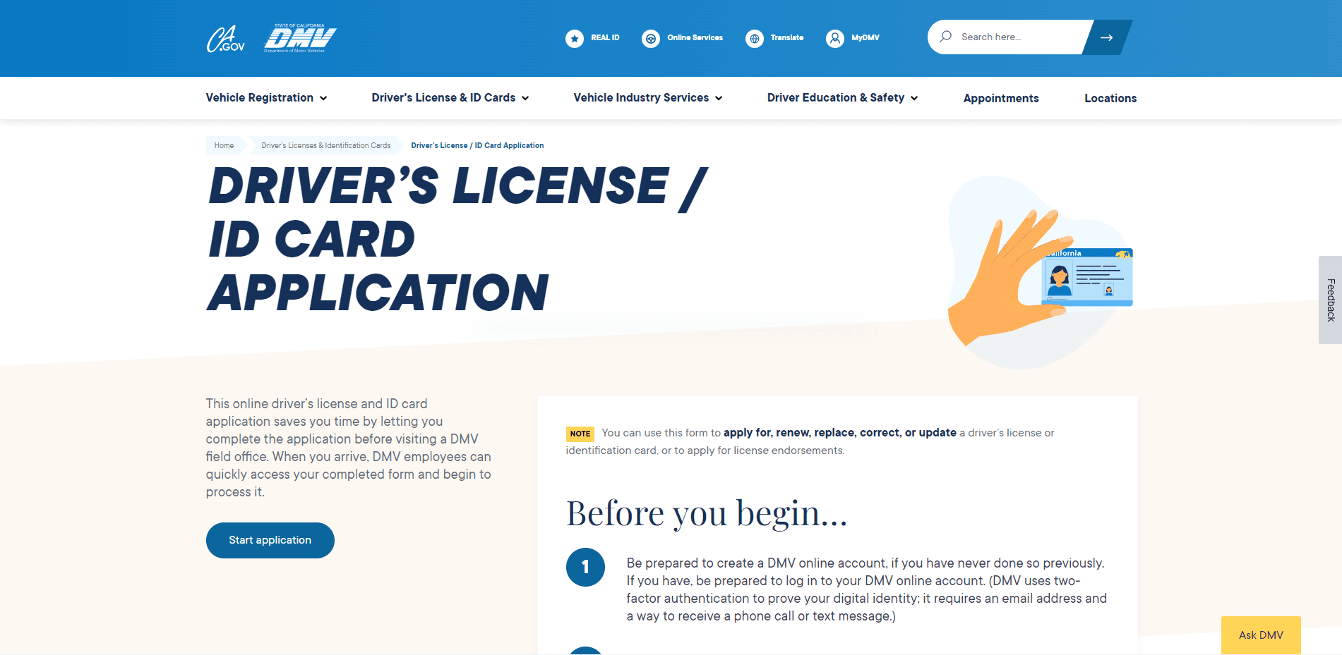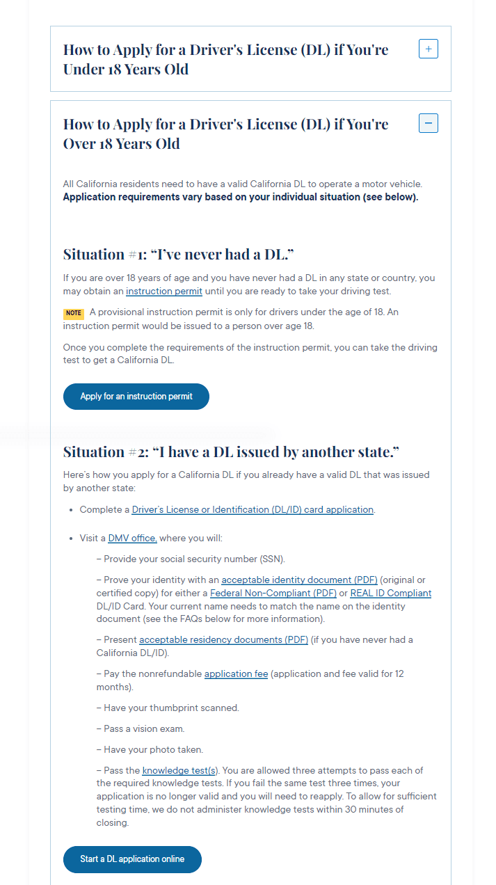 The application for a driver's license is buried within detailed descriptions, making it challenging to navigate the application process.