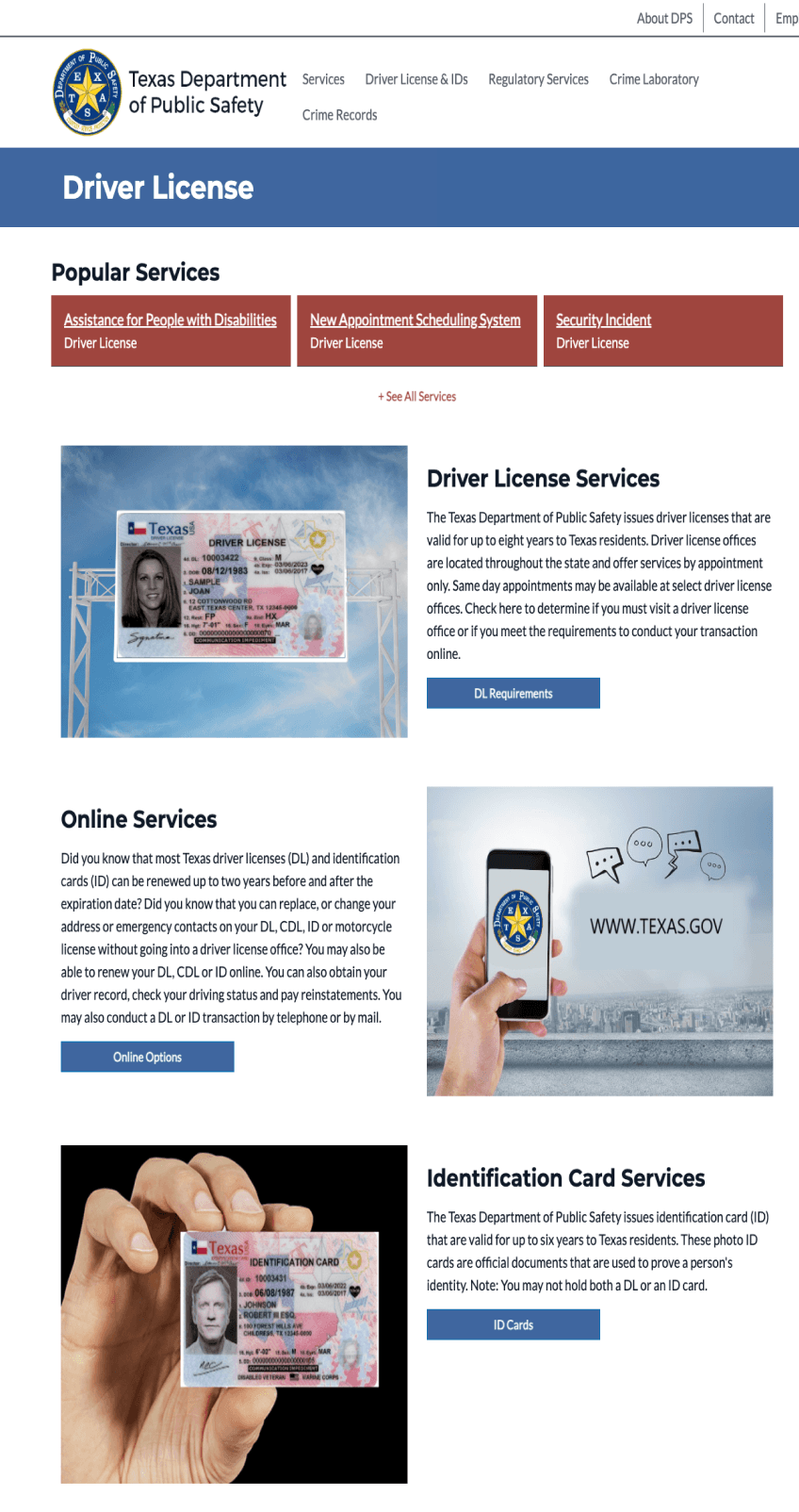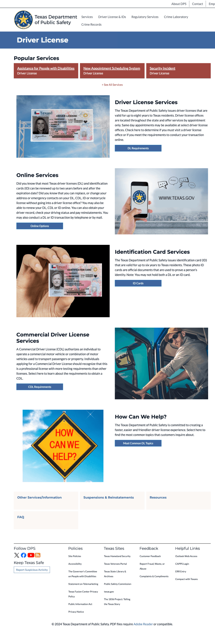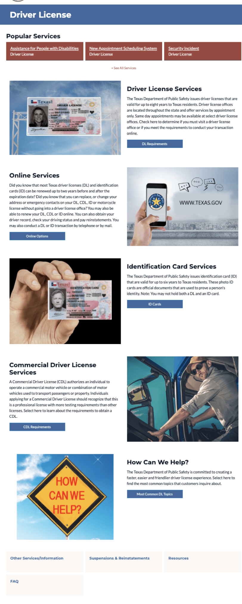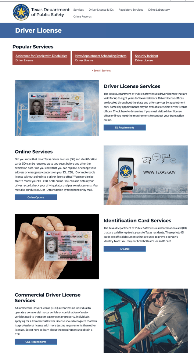 "Driver License Services," "Online Services," "Identification Card Services," and "Commercial Driver License Services" represent generic services that are not subject to frequent changes.