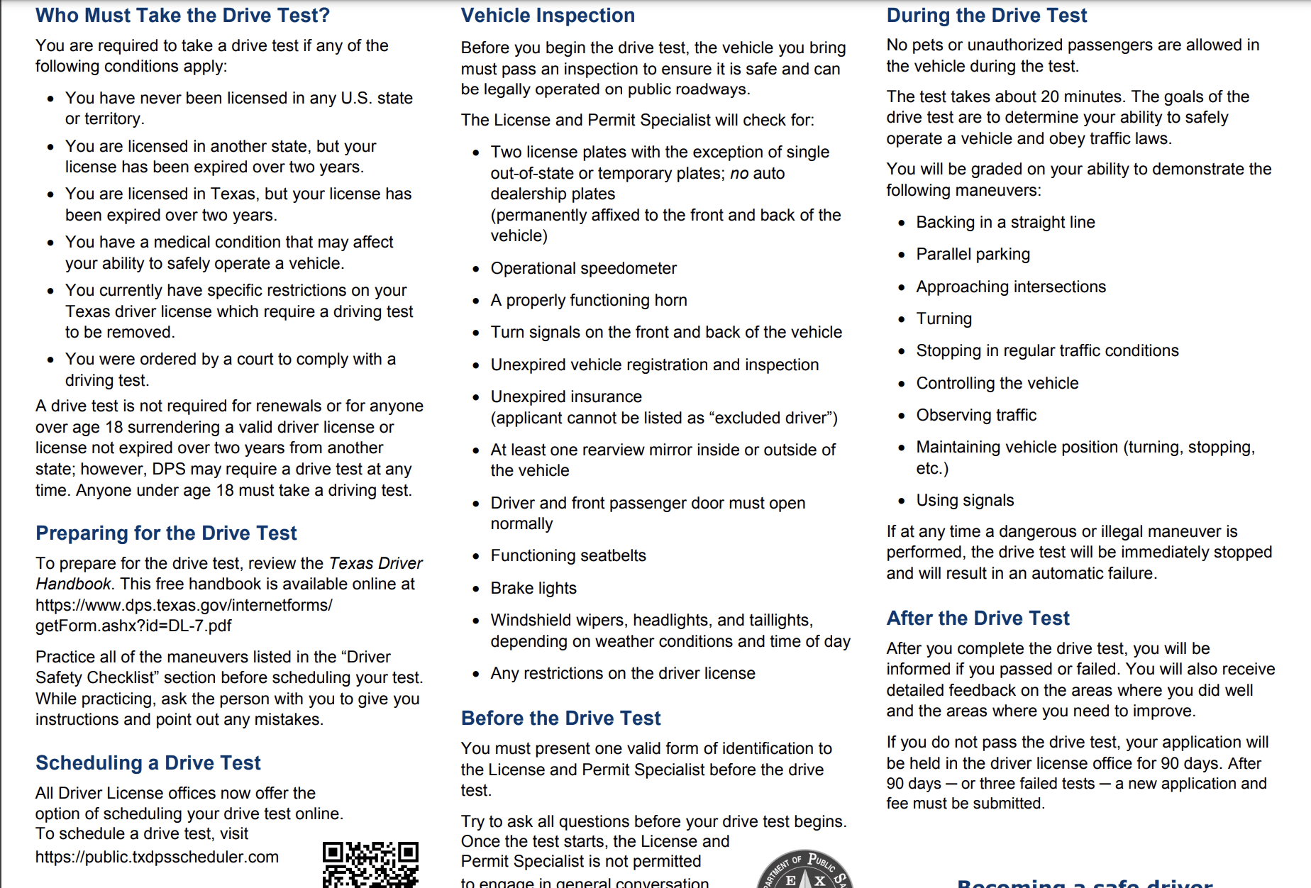 No pets or unauthorized passengers are allowed in the vehicle during the test. The test takes about 20 minutes. The goals of the drive test are to determine your ability to safely operate a vehicle and obey traffic laws.
