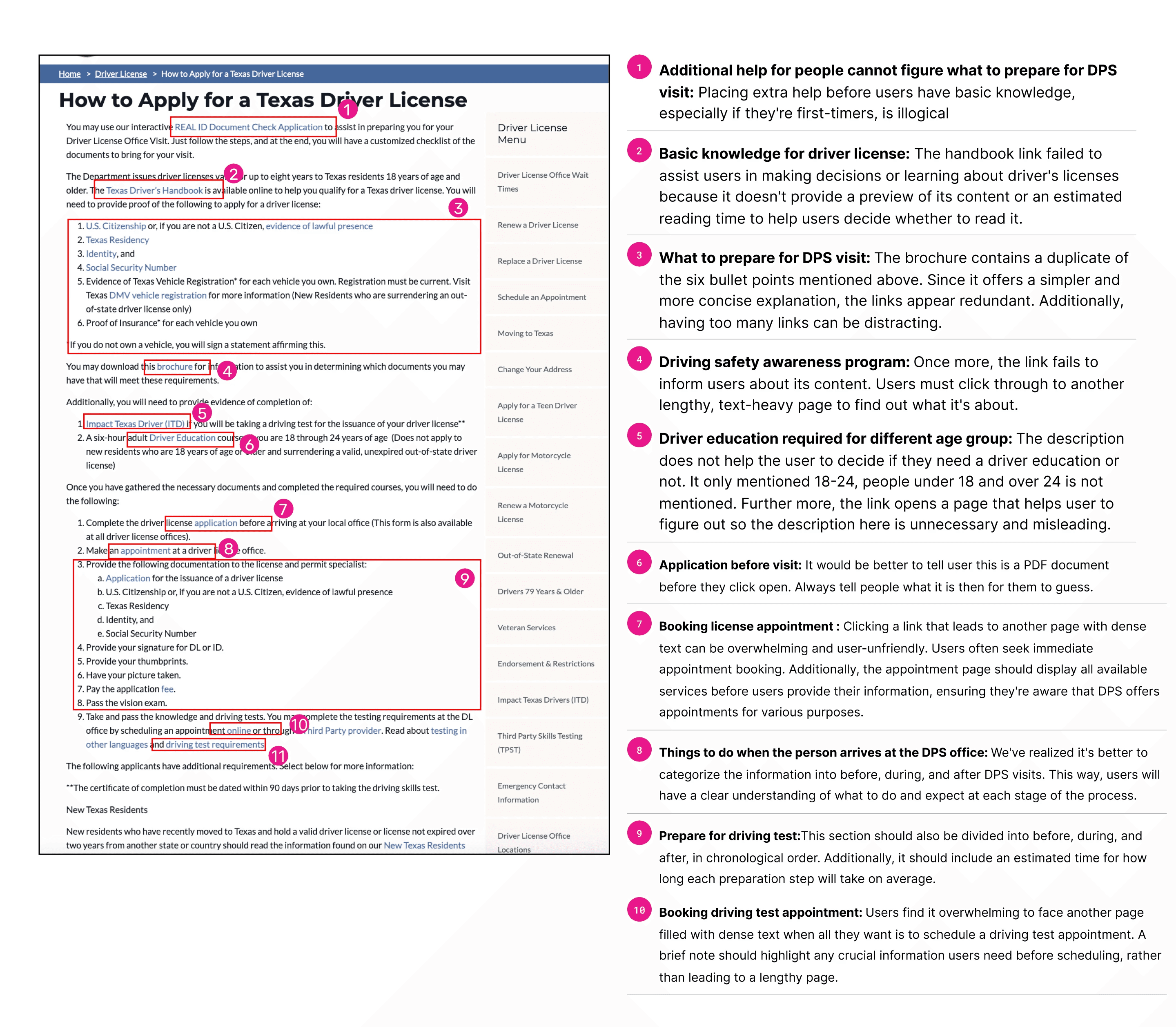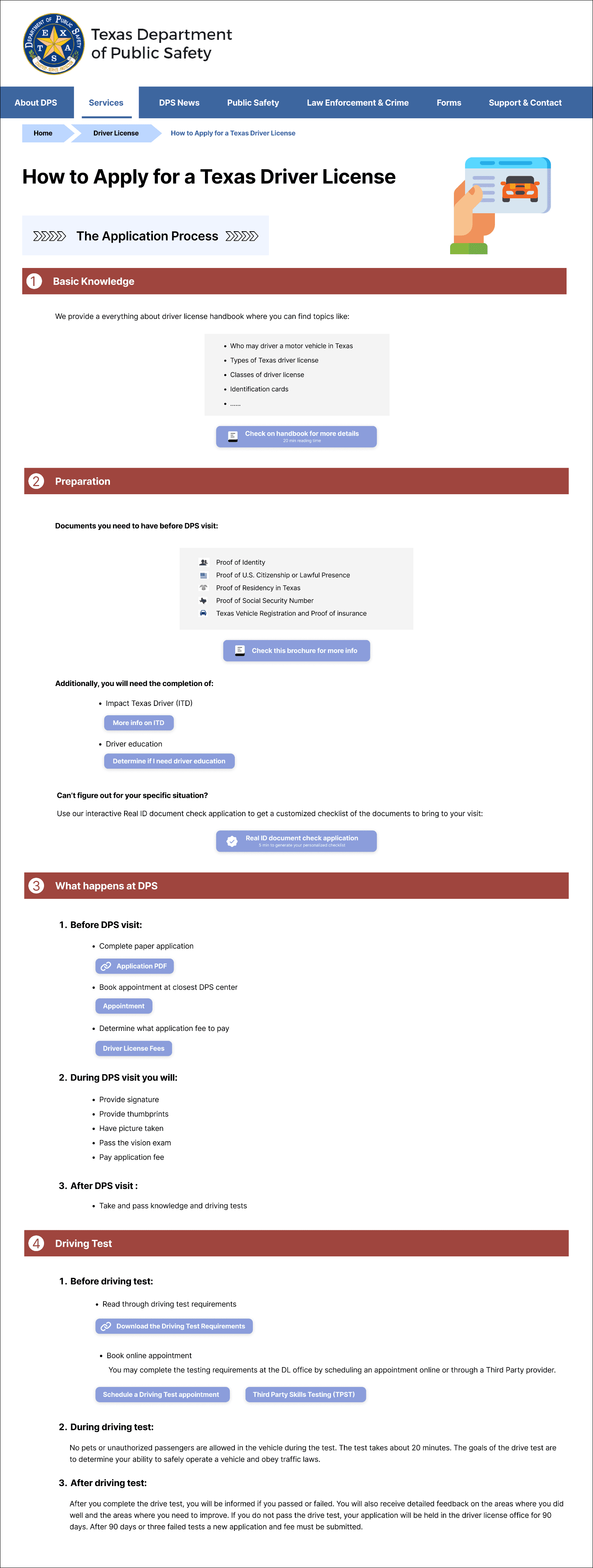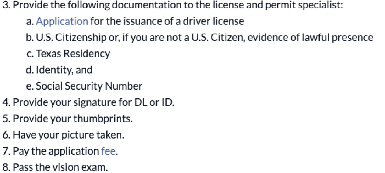 Things to do when the person arrives at the DPS office: While it is in chronological order it is still a huge chunk of info. Does not give user a clear understanding of what to do and expect at each stage of the DPS visit.