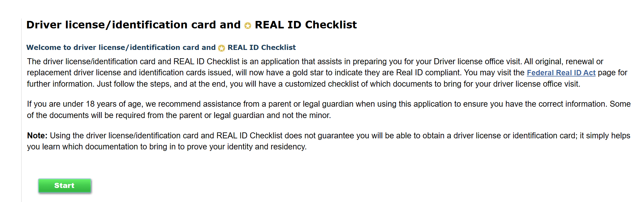 Use our interactive Real ID document check application to get a customized checklist of the documents to bring to your visit: