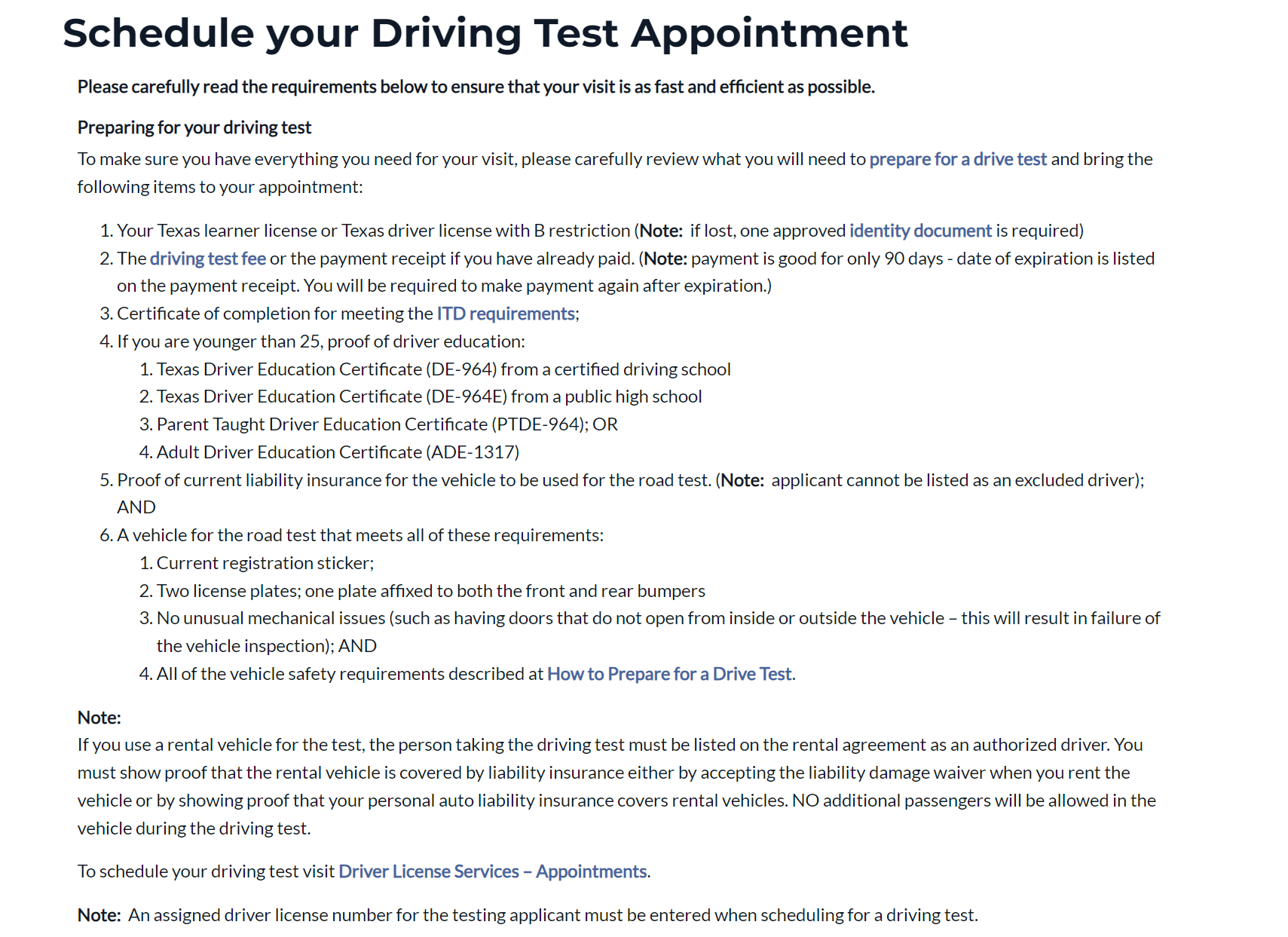 Booking driving test appointment: This section should have a brief note to highlight any crucial information user needs before scheduling appointment, rather throwing them a link that leading to another lengthy page.